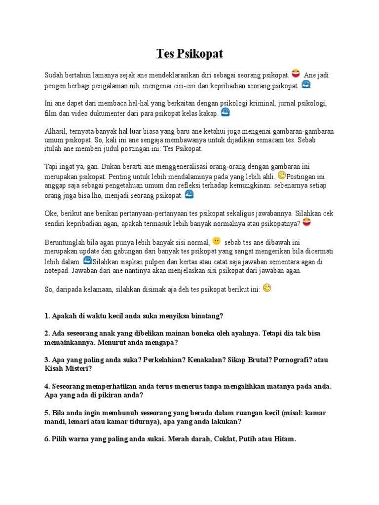 Tes psikopat dan jawabannya terbaru. Setiap orang punya jalan sikap yang berbeda untuk. Test apakah kamu psikopat. Nah untuk itu simak rekomendasi film psikopat terbaik dan tersadis yang dapat memacu adrenalinmu.