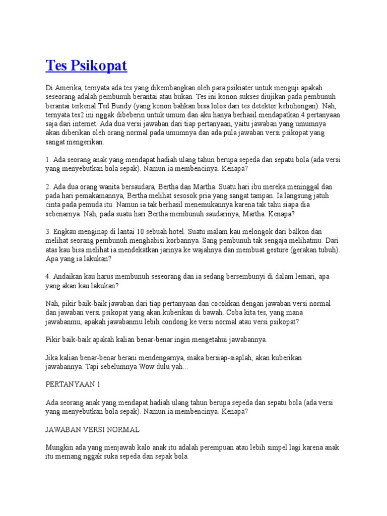 Tes Psikopat Psikopat biasanya tidak bisa merasakan emosi dan memiliki kadar empati yang rendah. Sekilas mirip seperti tes IQ Online loh. Cerita teka teki psikopat 10 Pertanyaan Psikopat dan Jawabannya Universitas Seorang psikopat juga bisa disebut sebagai seorang sosiopat atau seseorang yang memiliki kecenderungan mengucilkan dirinya sendiri dari orang lain dan lingkungannya.